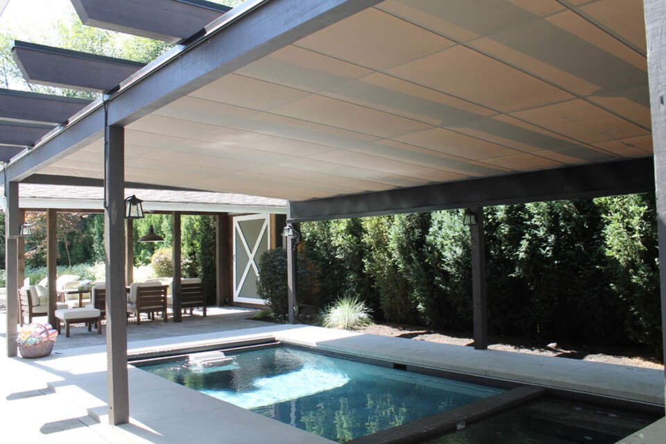 - مظلات قابلة للتحكم تسمح لك بتحديد درجة الظل التي تحتاج إليها. يمكن تعديل هذه المظلات لتوفير ظل كامل أو جزئي حسب الرغبة. وبالتالي، يمكنك التحكم في كمية الضوء والحرارة التي تدخل منطقة المسبح.